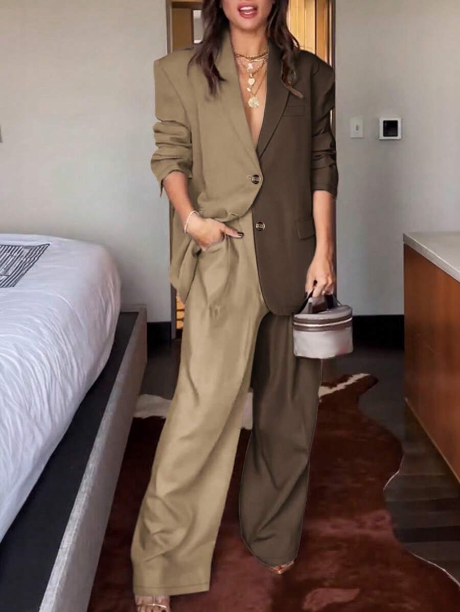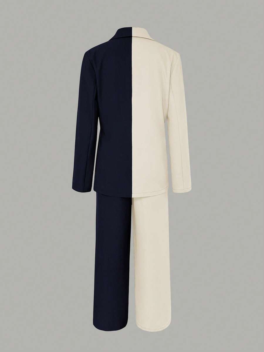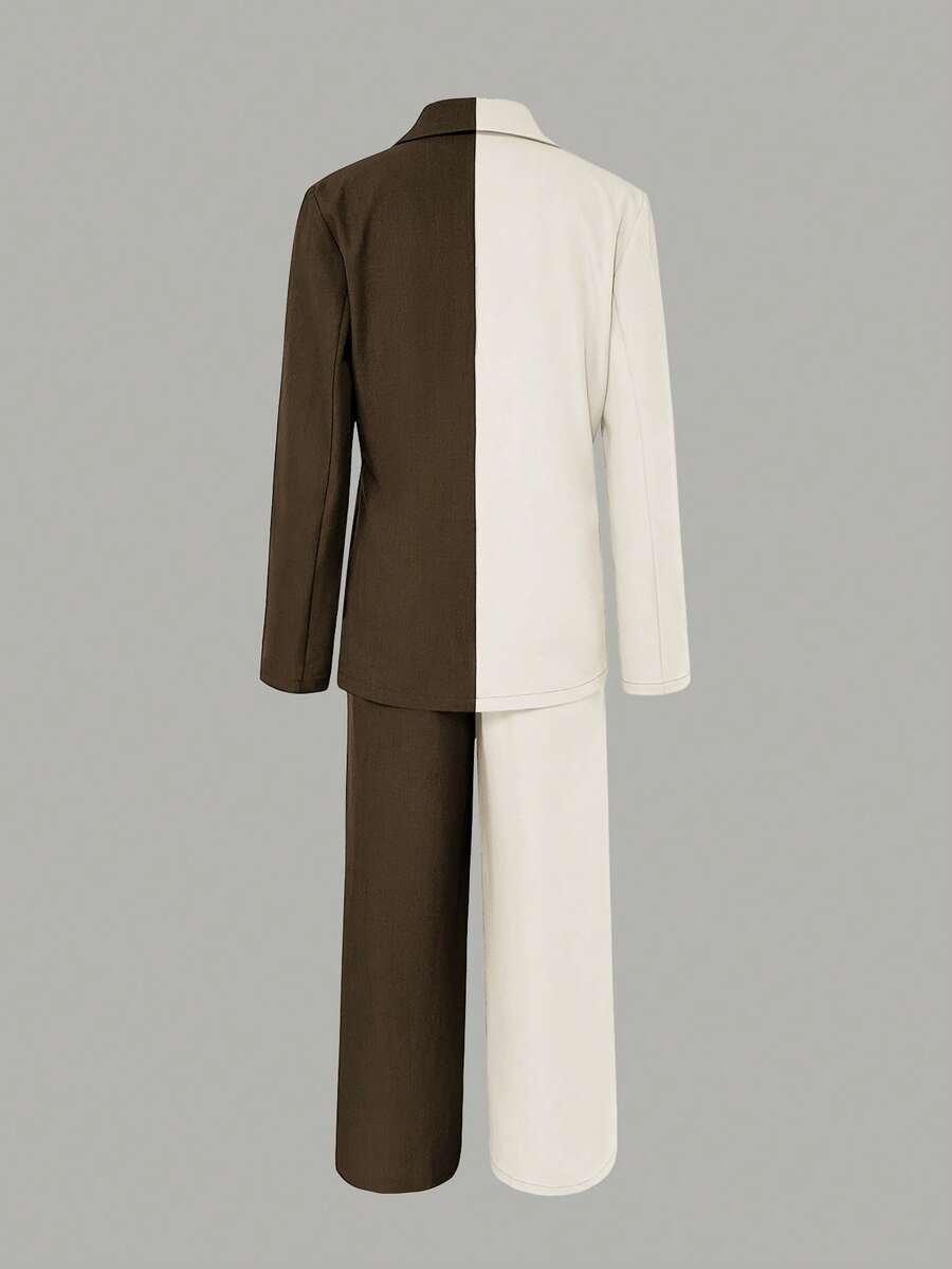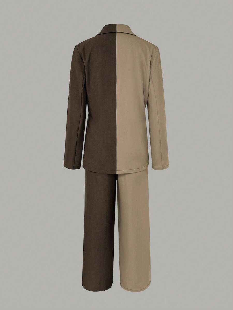 Tento výrazný dvoudílný outfit se vyznačuje jedinečným designem v dvoubarevném provedení, který kombinuje dva odstíny v jedné splývavé siluetě. Sako má klasické vroubkované klopy, strukturovaná ramena a uvolněný střih s jedním knoflíkem. Široké kalhoty odrážejí dvoubarevný styl a nabízejí pohodlí i sofistikovanost. Boční kapsy a rukávy po celé délce dotvářejí elegantní a moderní vzhled, který se perfektně hodí pro každodenní nošení i do kanceláře.