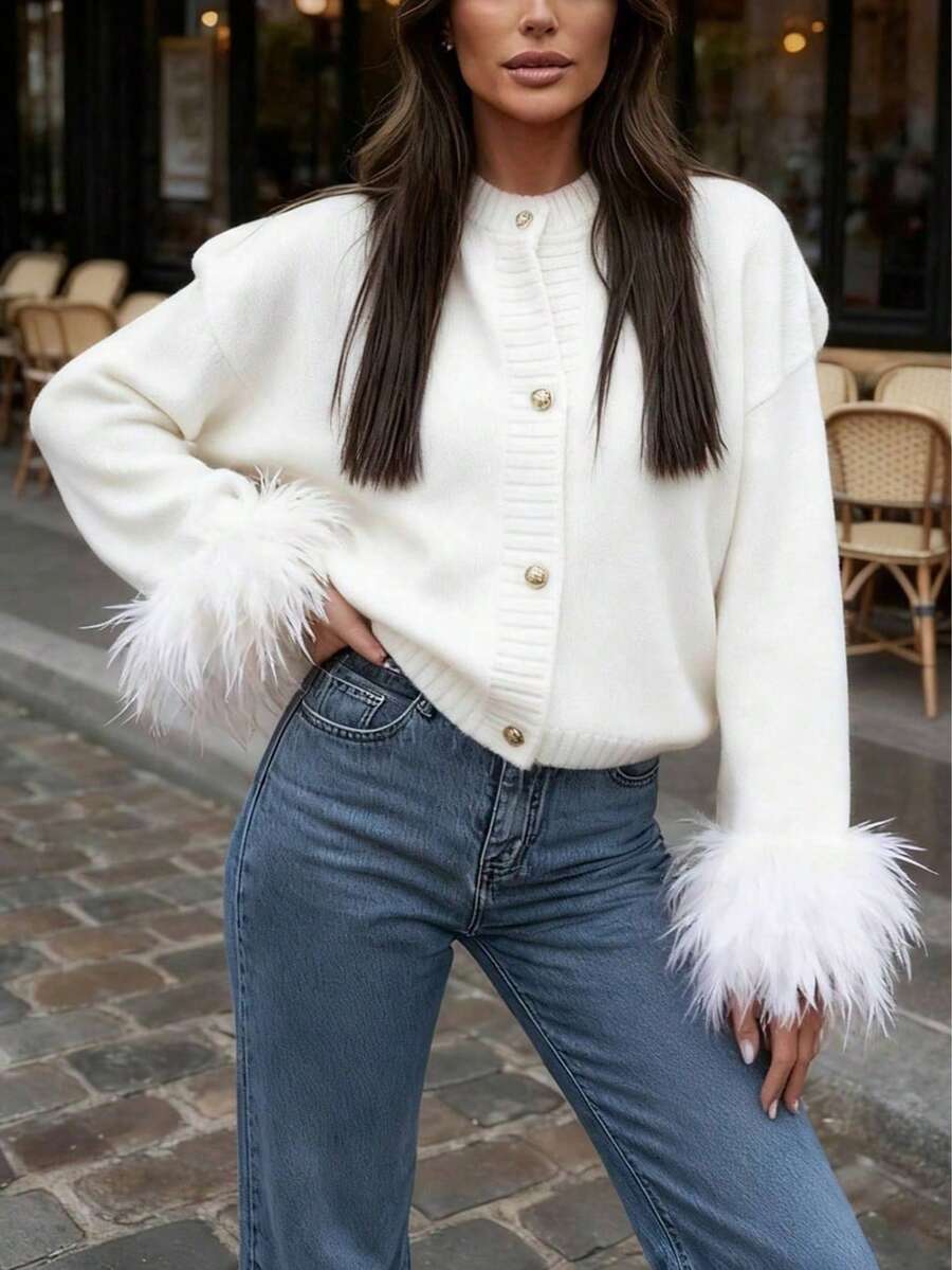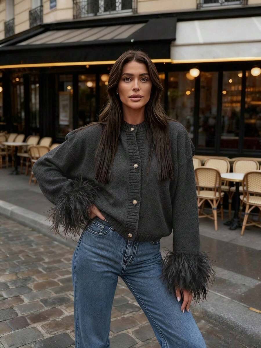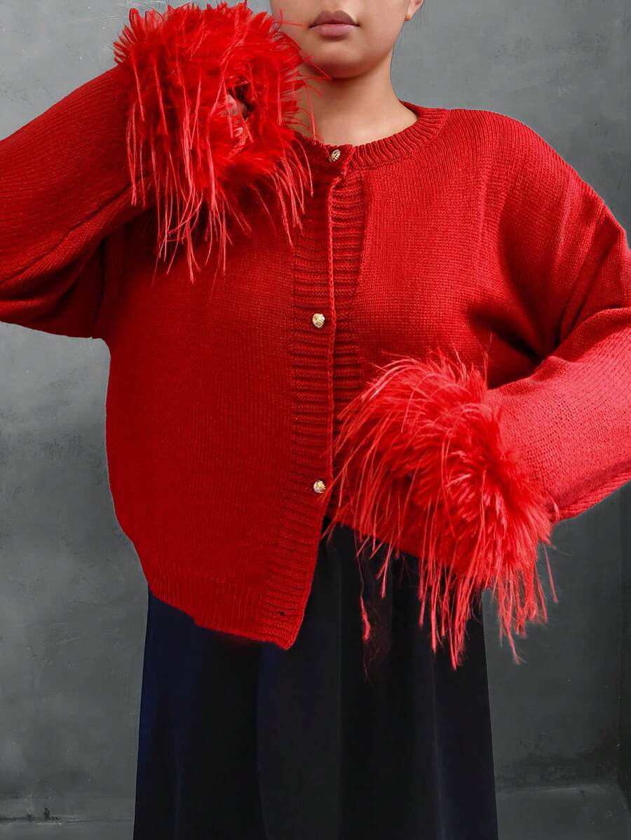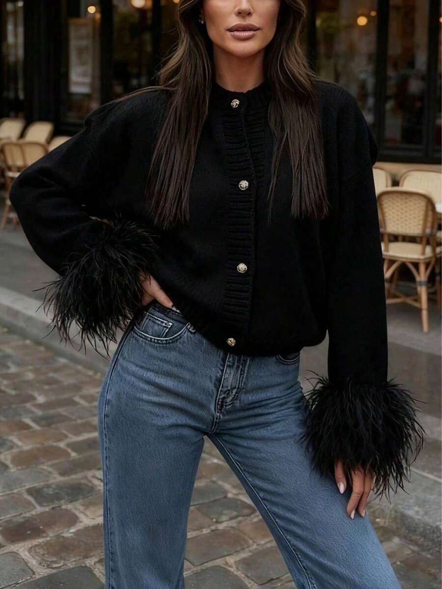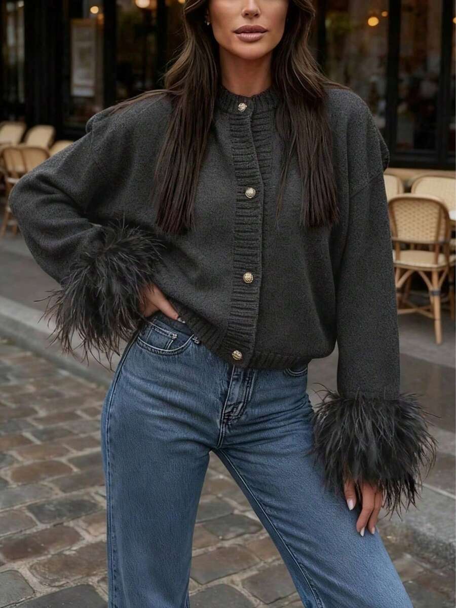 Udělejte si dojem s tímto kardiganem volného střihu s výraznými zlatými knoflíky vpředu a výrazným lemováním z imitace peří na manžetách. Klasický kulatý výstřih a spuštěné raglánové rukávy vytvářejí snadnou a lichotivou siluetu. Měkká pletená textura dodává kouzlo, zatímco dramatické manžety dodávají slavnostní nádech, který se skvěle hodí pro zvláštní příležitosti i stylové každodenní nošení.