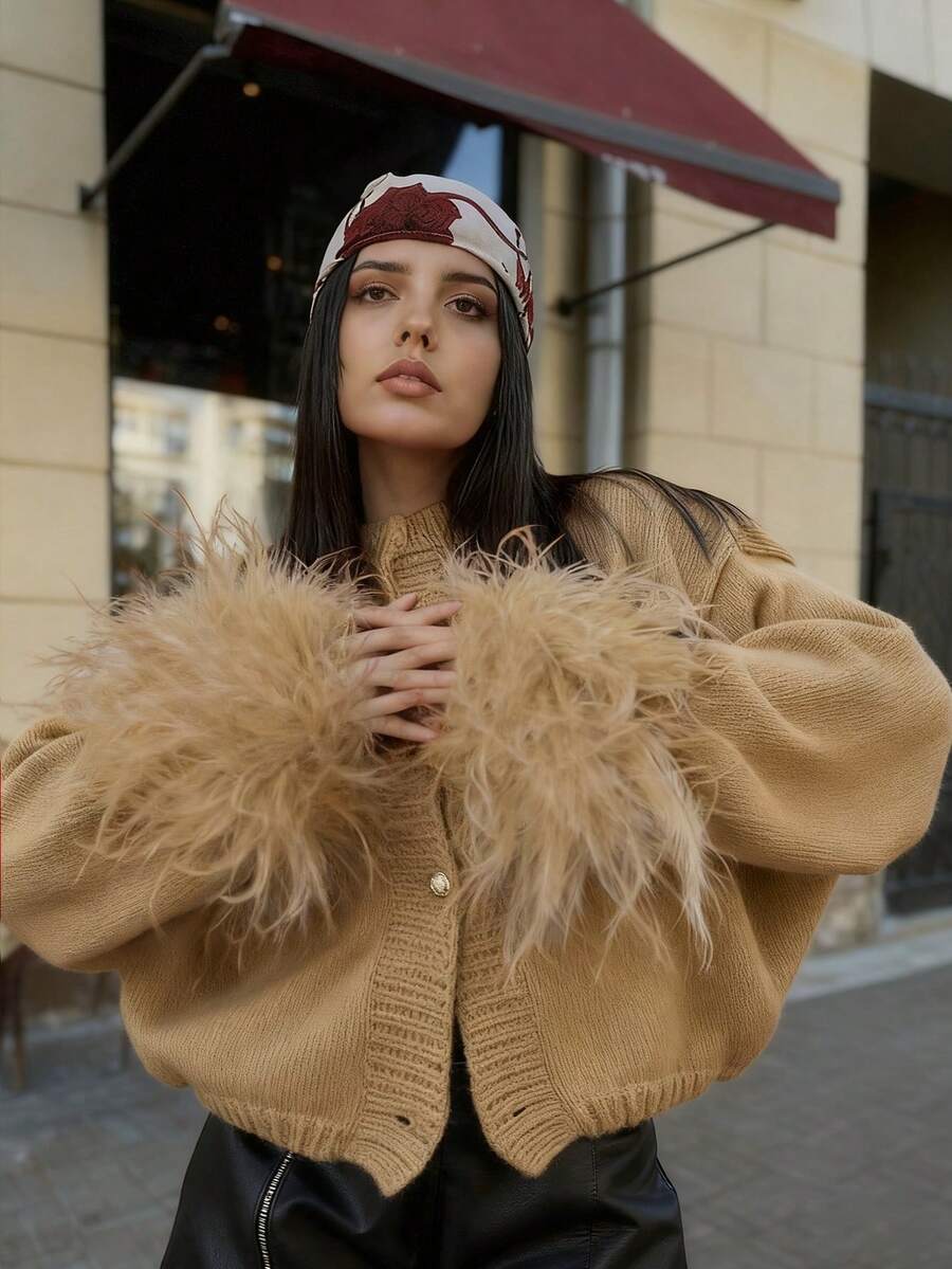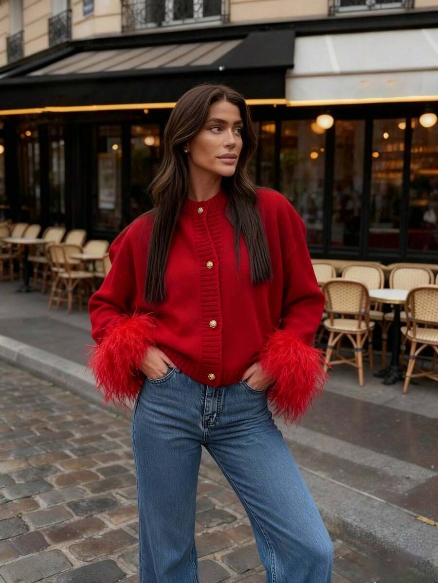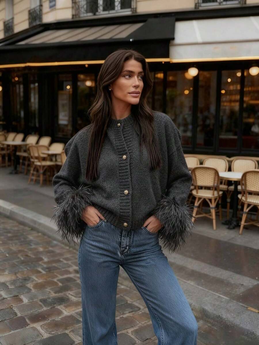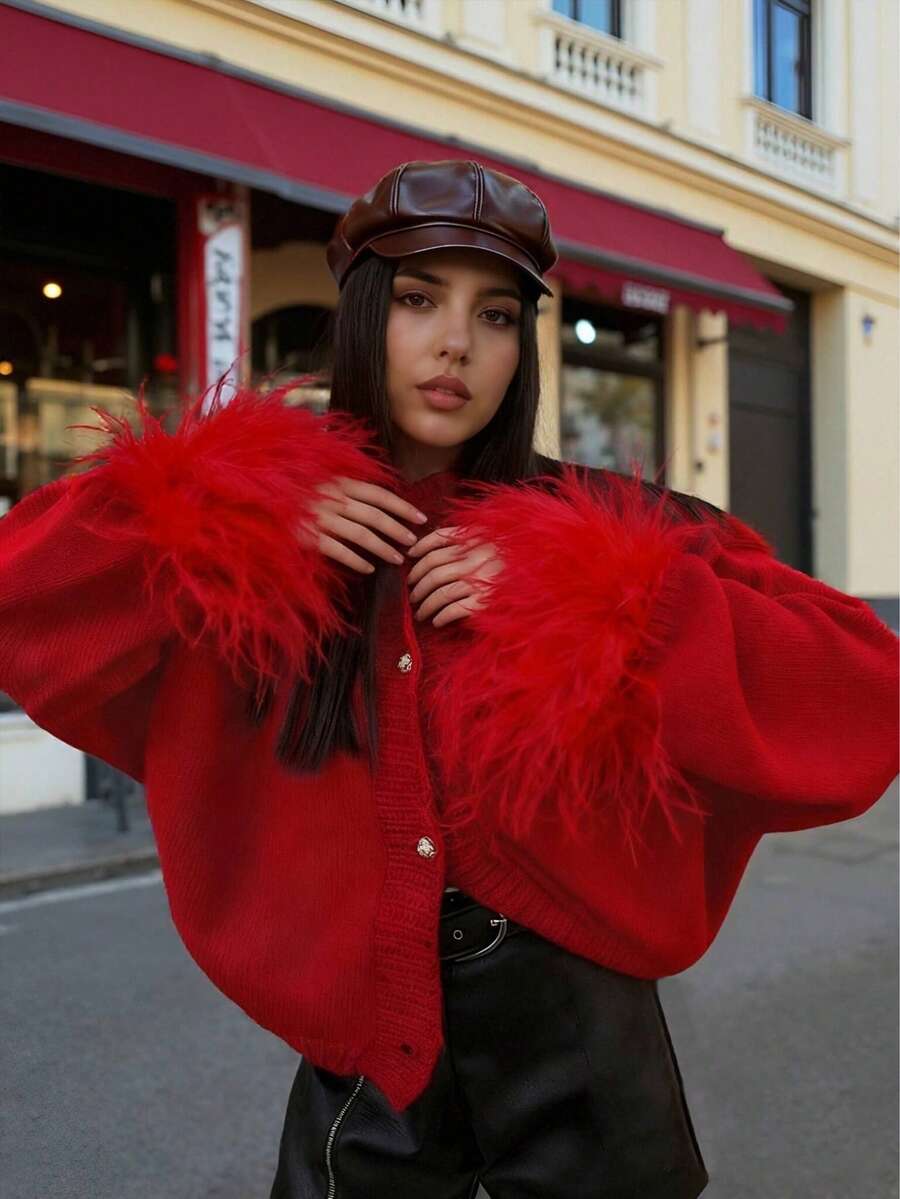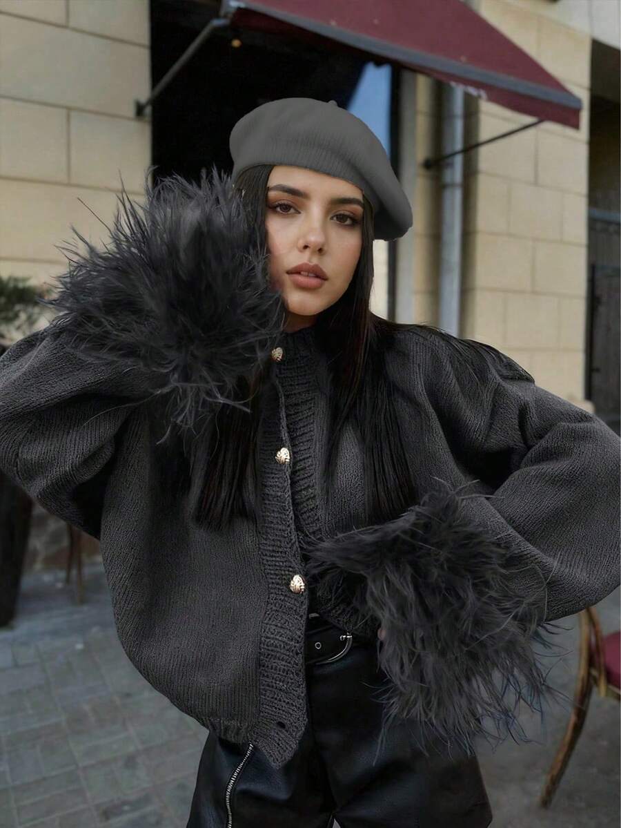 Udělejte si dojem s tímto kardiganem volného střihu s výraznými zlatými knoflíky vpředu a výrazným lemováním z imitace peří na manžetách. Klasický kulatý výstřih a spuštěné raglánové rukávy vytvářejí snadnou a lichotivou siluetu. Měkká pletená textura dodává kouzlo, zatímco dramatické manžety dodávají slavnostní nádech, který se skvěle hodí pro zvláštní příležitosti i stylové každodenní nošení.