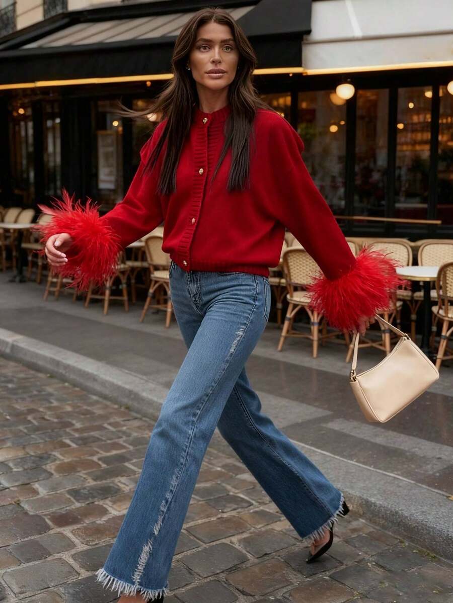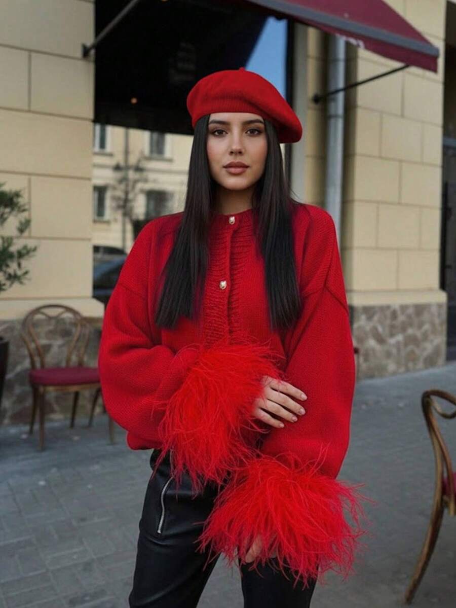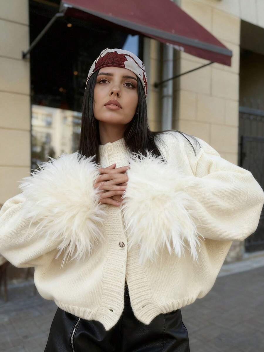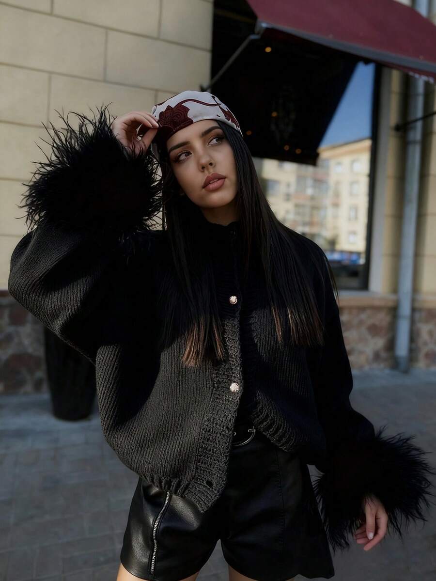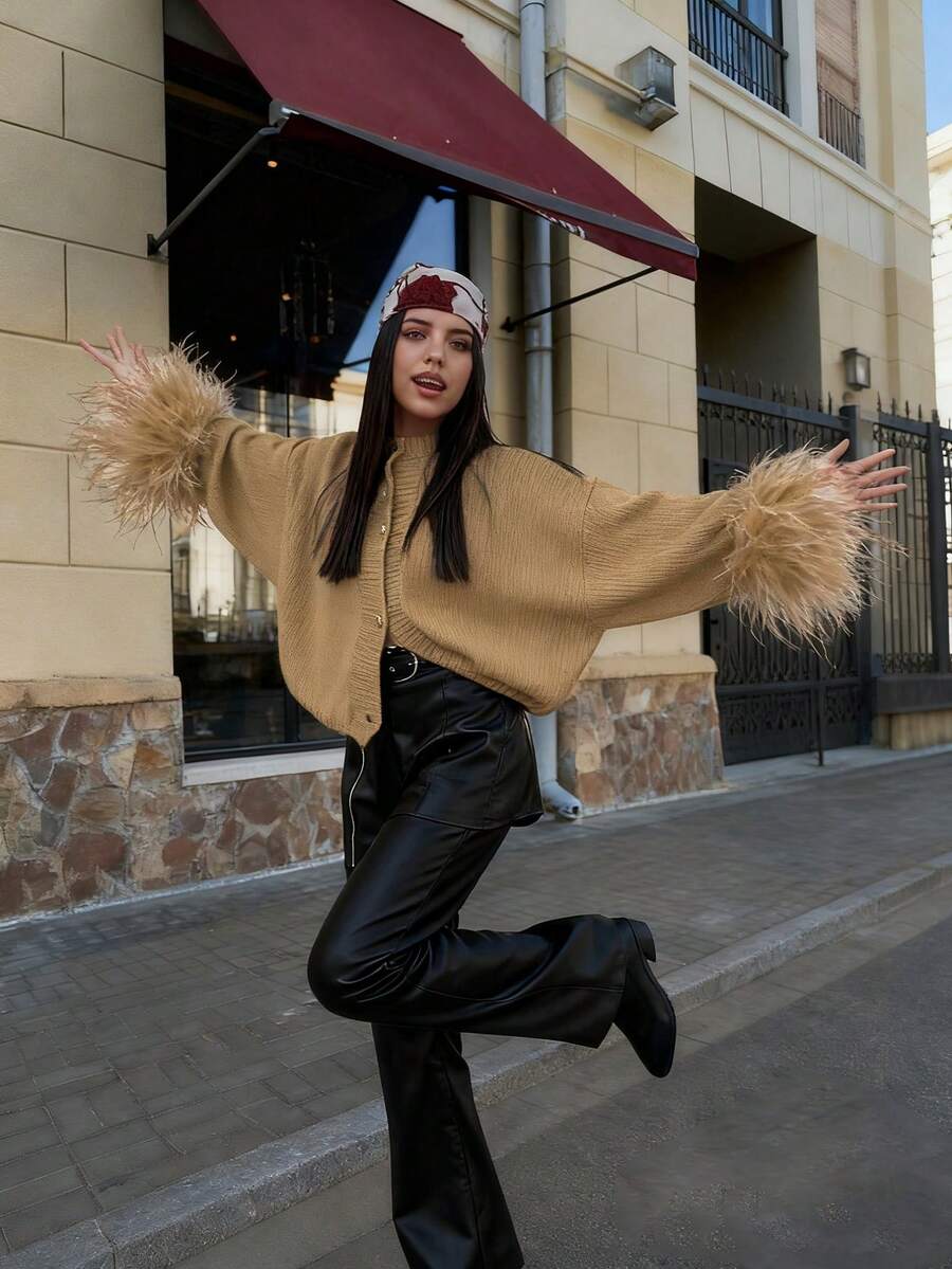Udělejte si dojem s tímto kardiganem volného střihu s výraznými zlatými knoflíky vpředu a výrazným lemováním z imitace peří na manžetách. Klasický kulatý výstřih a spuštěné raglánové rukávy vytvářejí snadnou a lichotivou siluetu. Měkká pletená textura dodává kouzlo, zatímco dramatické manžety dodávají slavnostní nádech, který se skvěle hodí pro zvláštní příležitosti i stylové každodenní nošení.