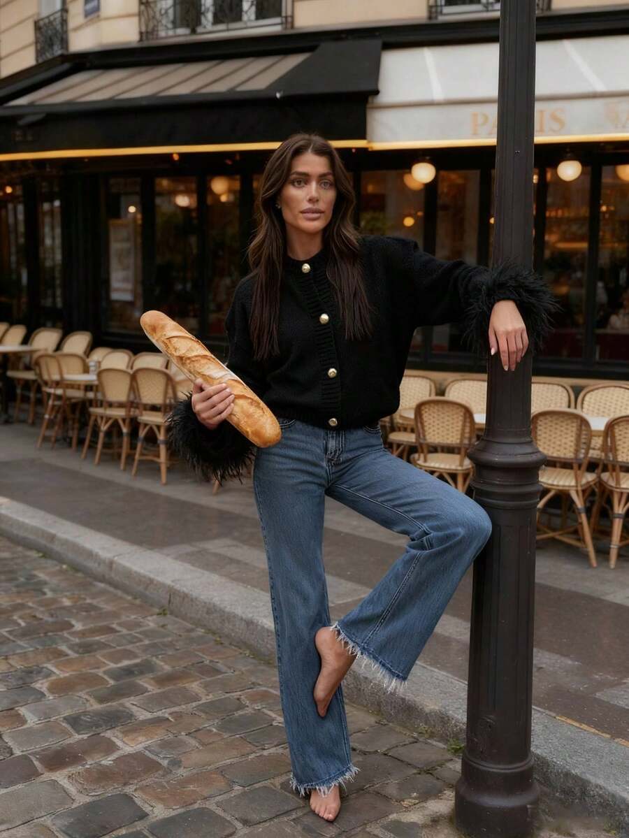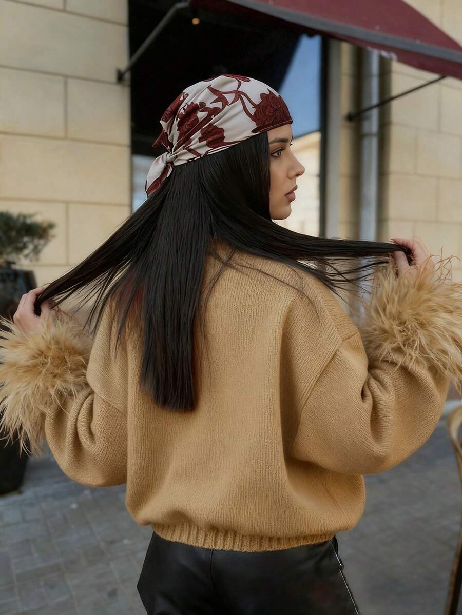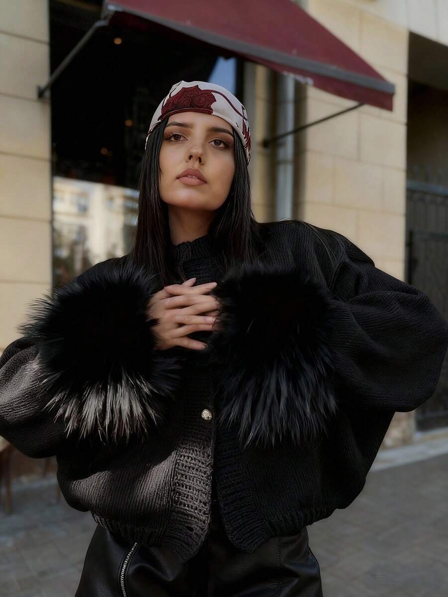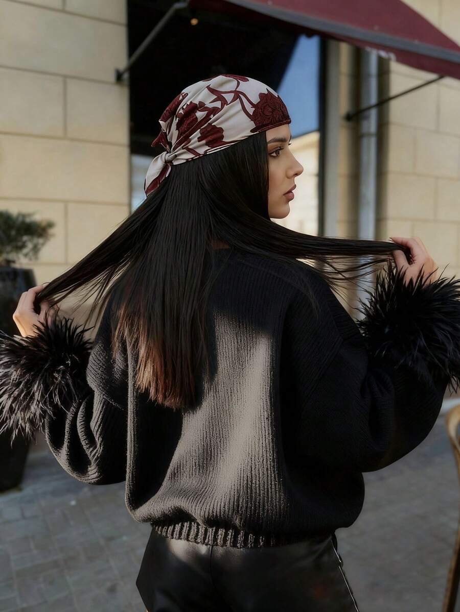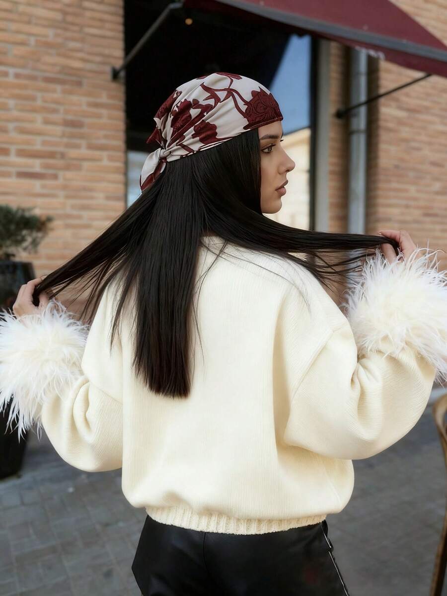 Udělejte si dojem s tímto kardiganem volného střihu s výraznými zlatými knoflíky vpředu a výrazným lemováním z imitace peří na manžetách. Klasický kulatý výstřih a spuštěné raglánové rukávy vytvářejí snadnou a lichotivou siluetu. Měkká pletená textura dodává kouzlo, zatímco dramatické manžety dodávají slavnostní nádech, který se skvěle hodí pro zvláštní příležitosti i stylové každodenní nošení.