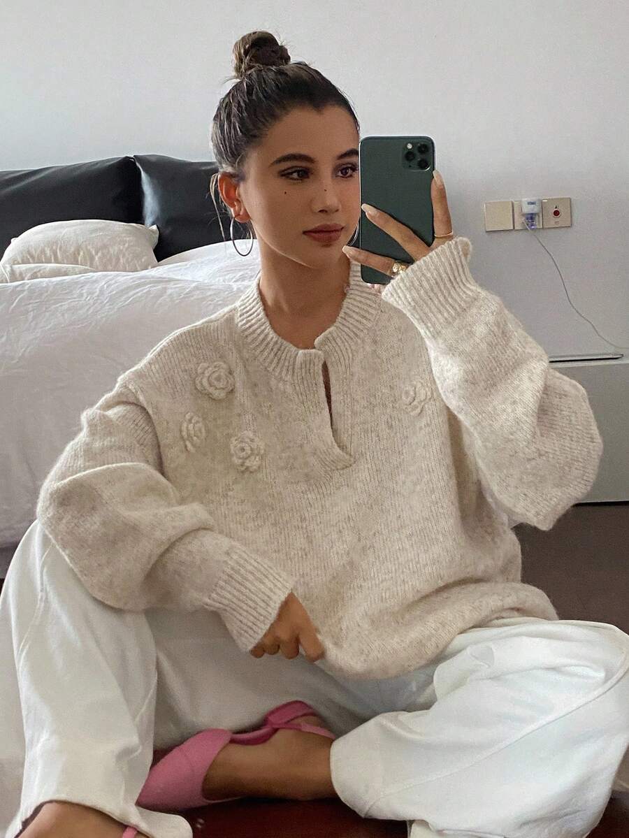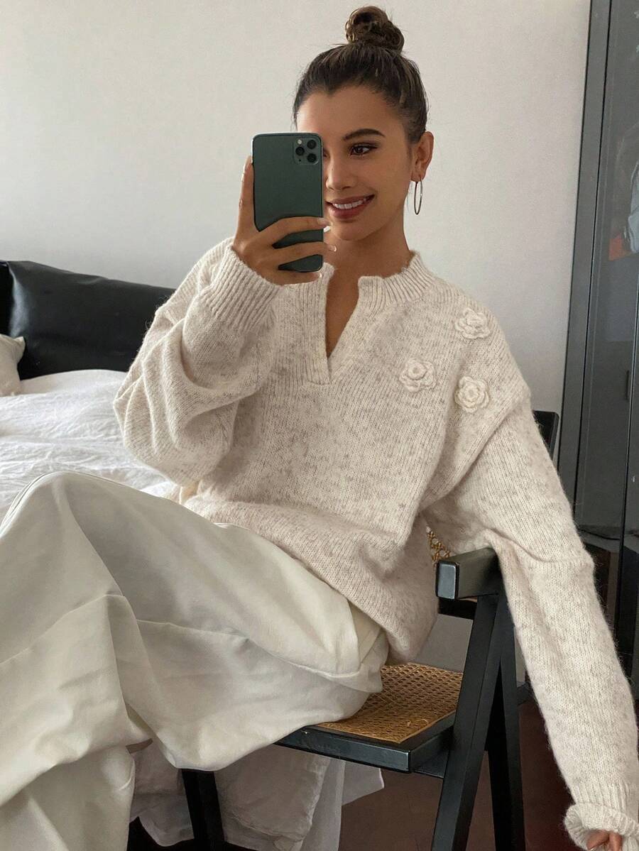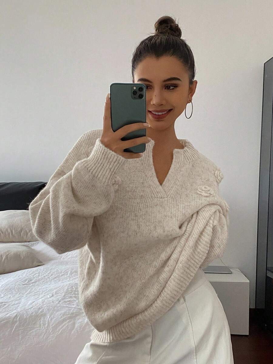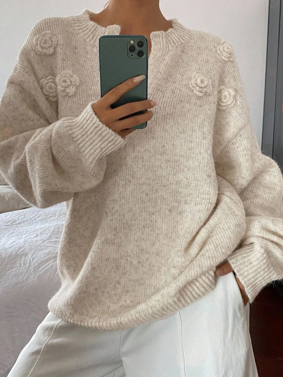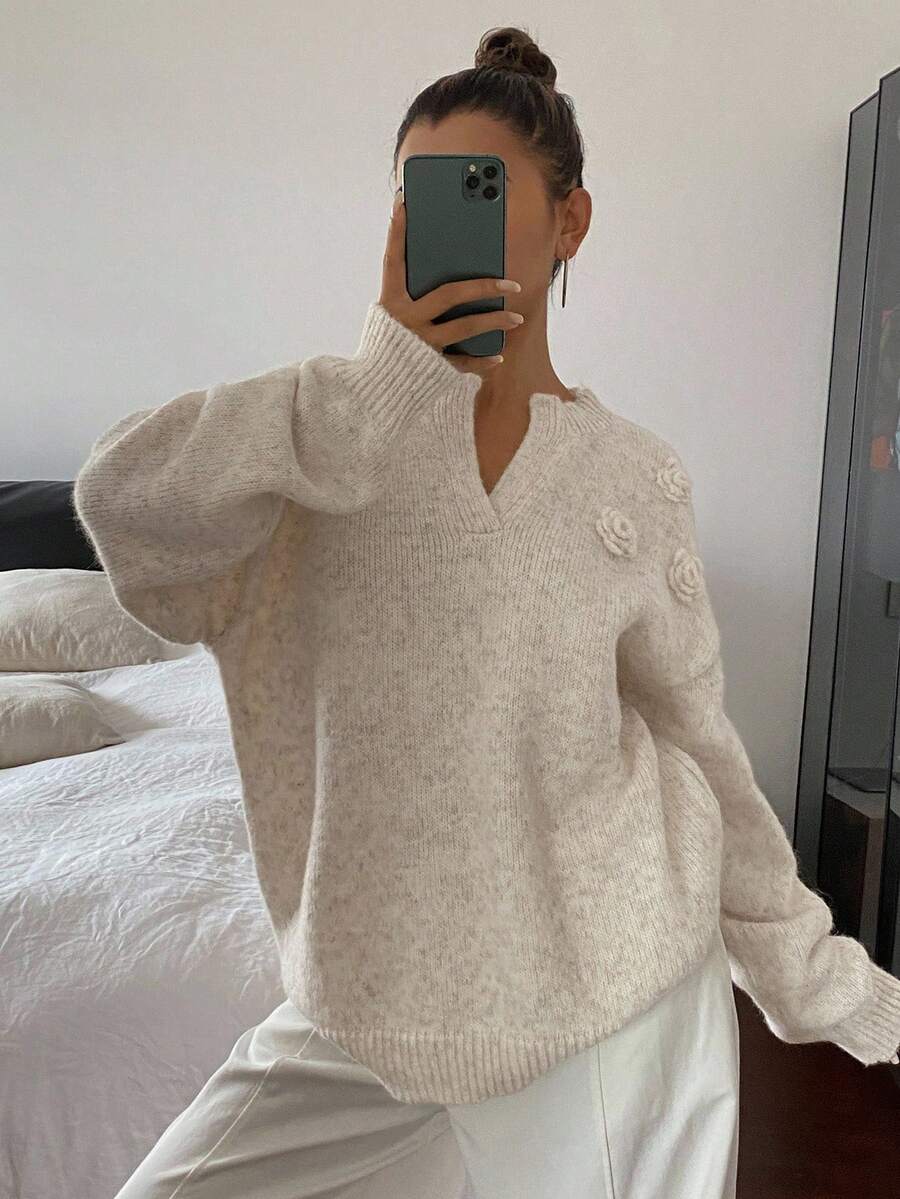 DAZY Dames 3D bloemendecor V-hals losse ležérní elegantní svetr trui herfst/winter